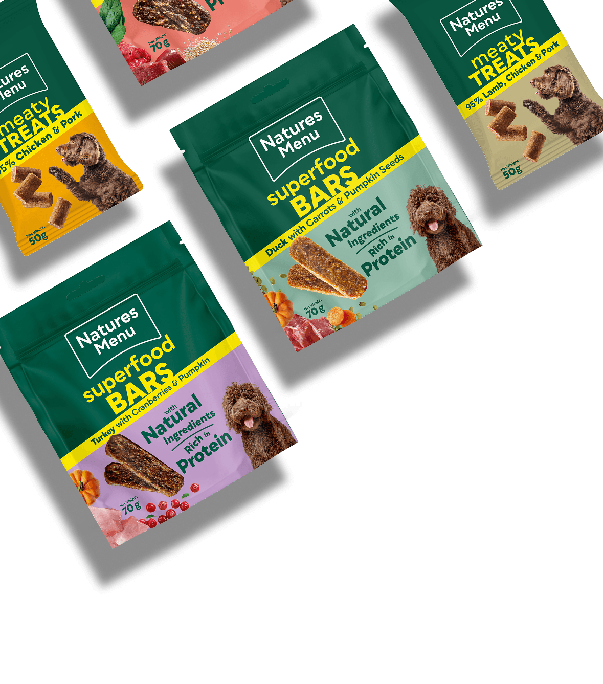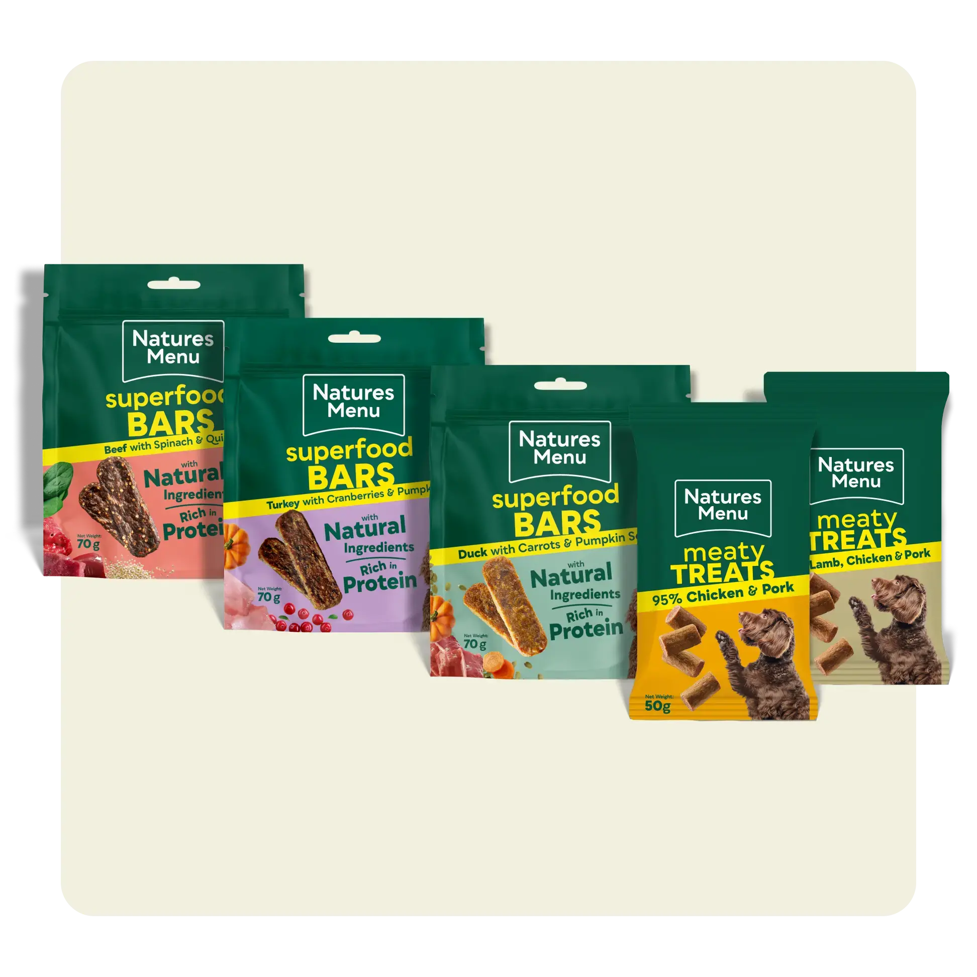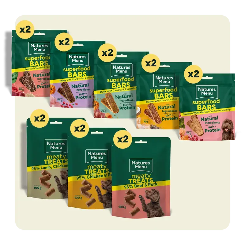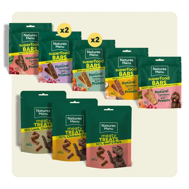 A bigger variety of flavours to explore Includes 3 meaty treats and 5 superfood bar flavours